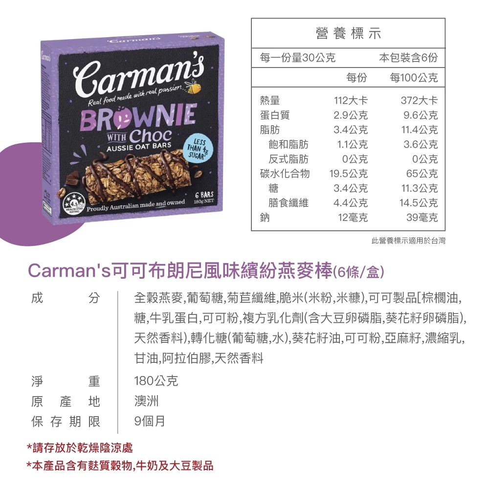 Carmans 可可布朗尼風味繽紛燕麥棒 (6條/盒)