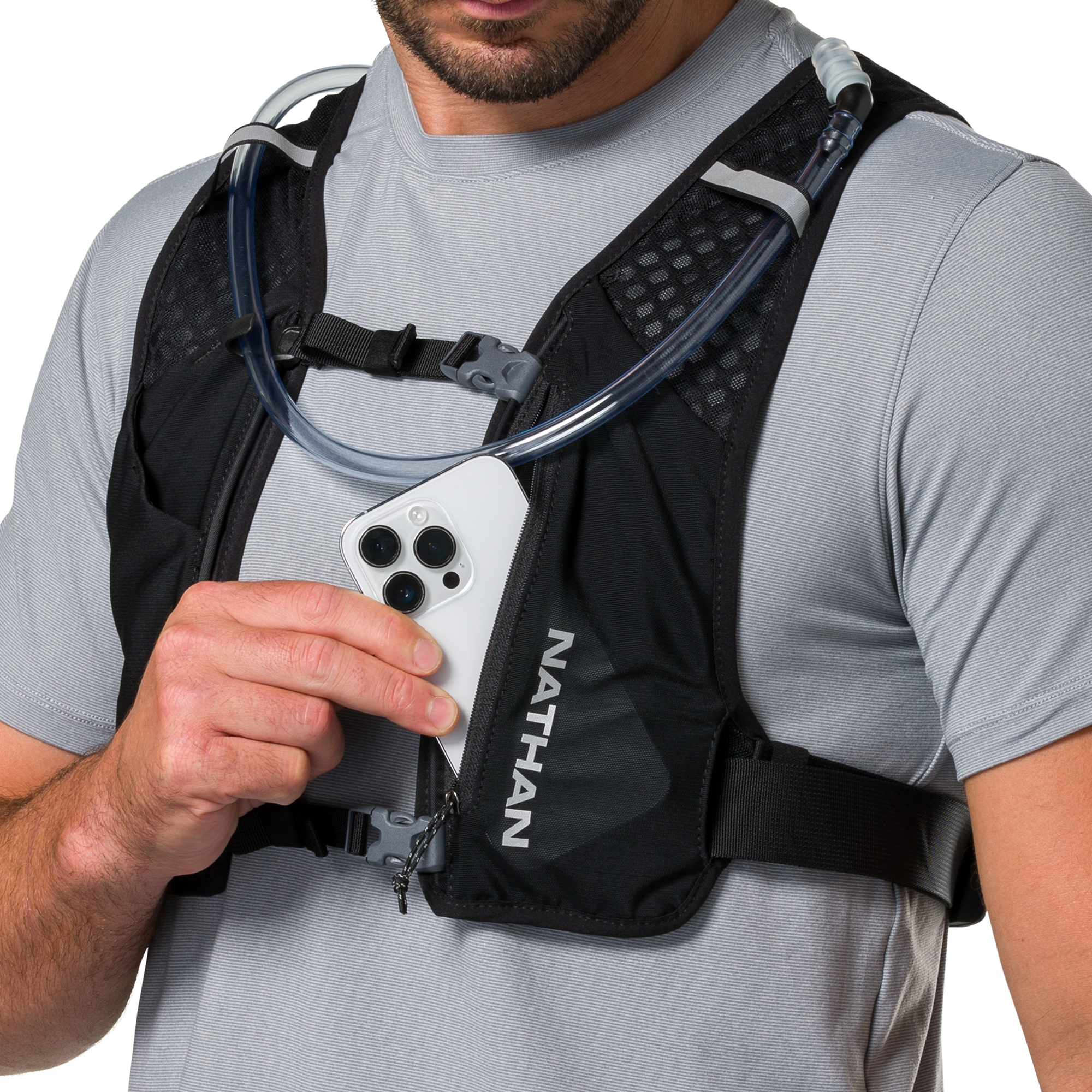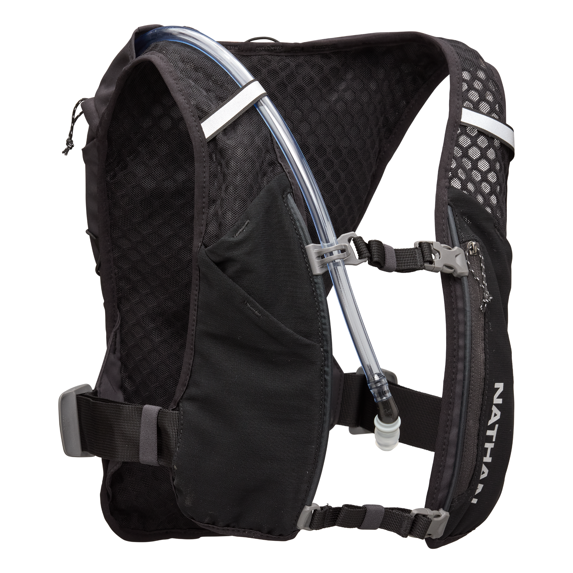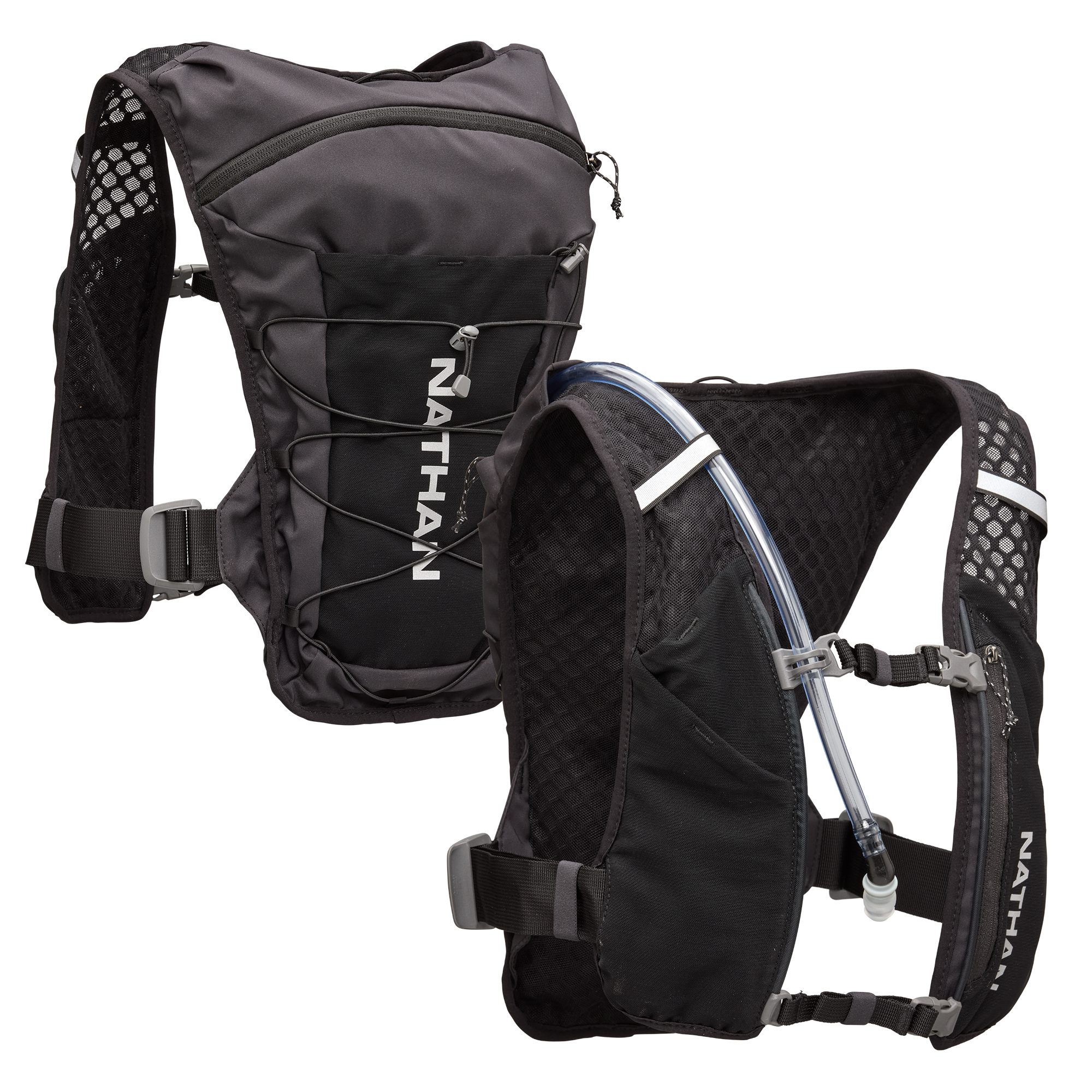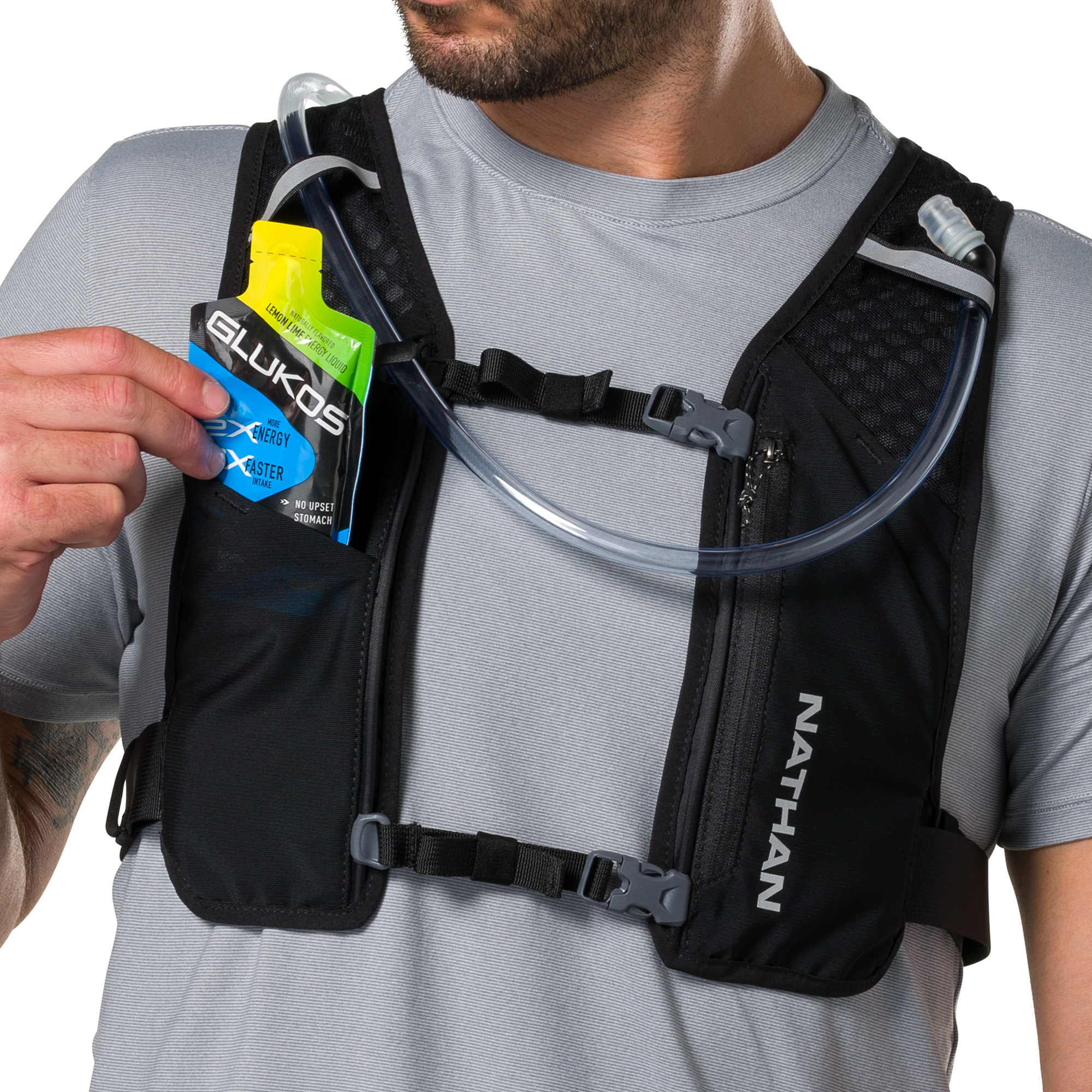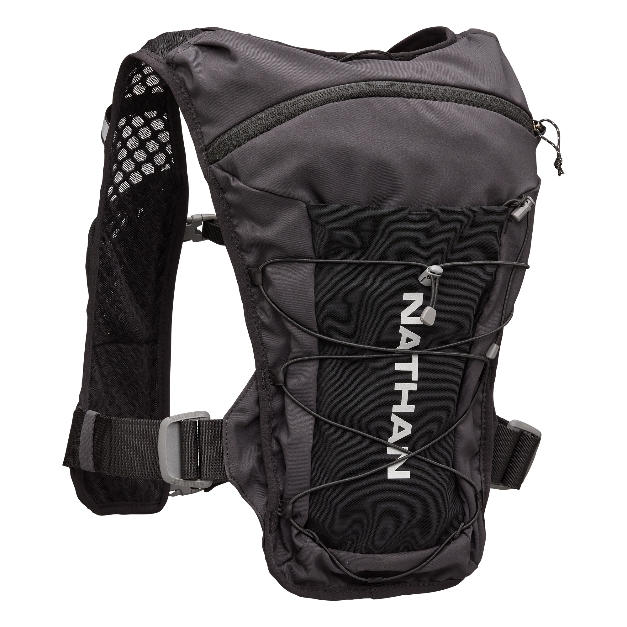前肩帶配置拉鍊動力網布口袋與插入式軟壺收納層,取用補給品快速順手。