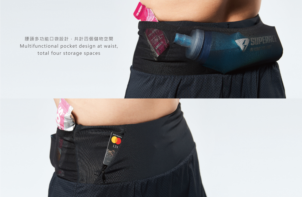 腰頭結合多功能口袋設計,後中可穩定放置如500ML以內的軟水壺、7吋以內手機…等較大尺寸物品,兩側則提供快速補給的置物空間。前側另附有貴重物專屬拉鍊口袋。搭配腰繩可自由調節腰部鬆緊度。波浪裙搭配脇側開衩帶來便利更增添時尚感,適合越野跑或各式大動作運動的最佳裝備!