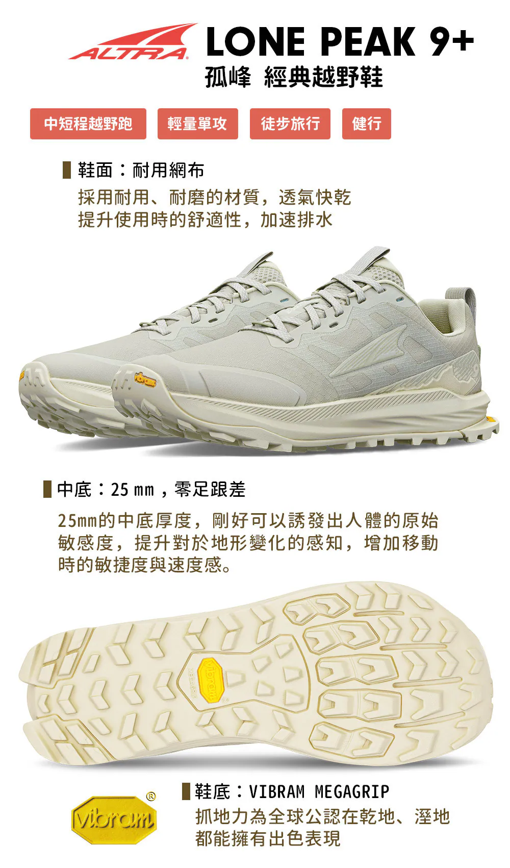在LONE PEAK 9+ 上與以往不同,採用了VIBRAM 知名的MEGAGRIP 鞋底,