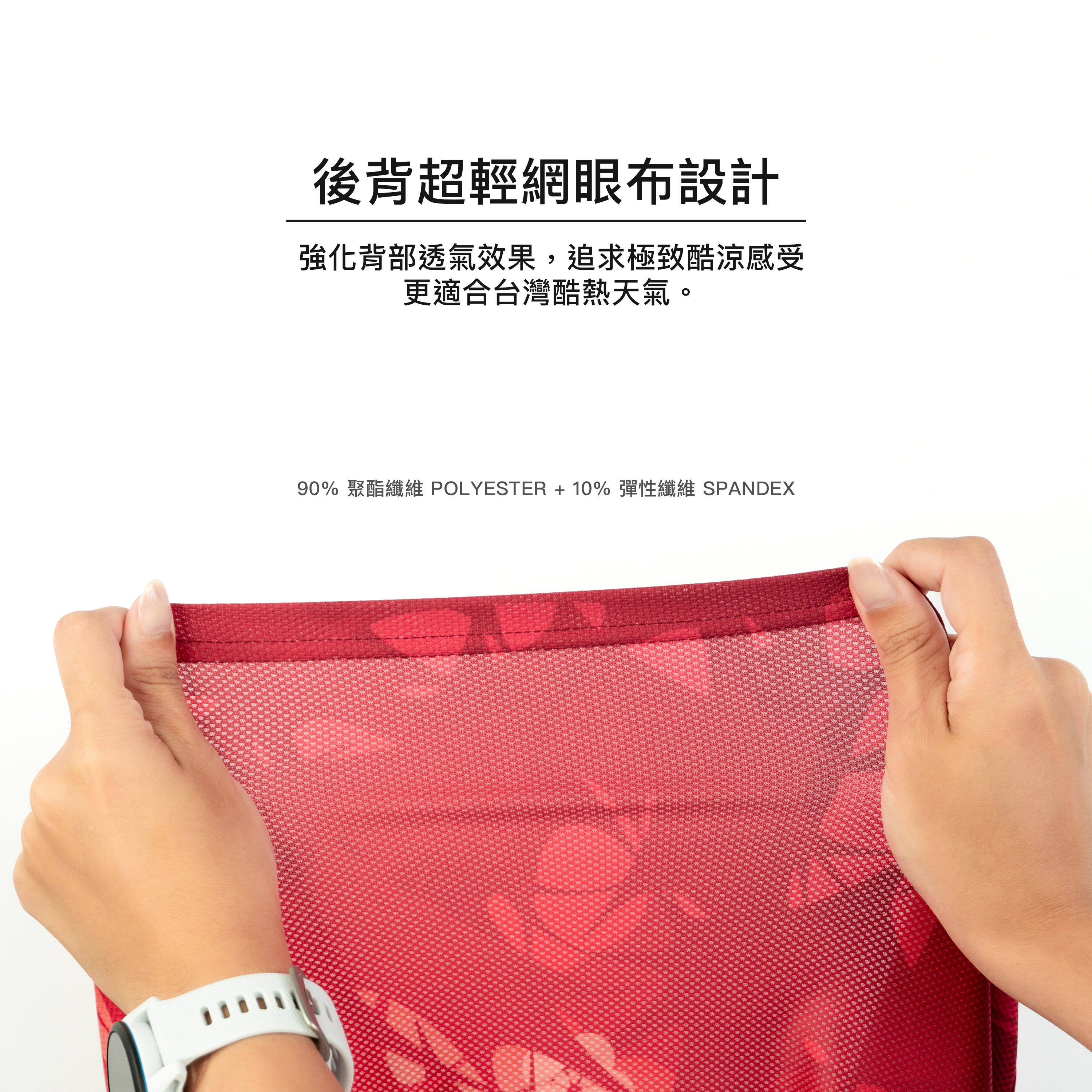 後網布: 90% 聚酯纖維 Polyester + 10% 彈性纖維 Spandex